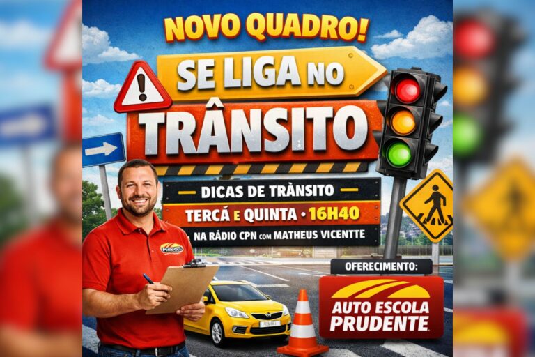 Estreia hoje, quinta-feira (19) o novo quadro “Se Liga no Trânsito”, que passa a integrar a programação do programa Se Liga – com Matheus Vicentte, na Rádio CPN – 100.9 FM. A novidade conta com o patrocínio da Auto Escola Prudente e tem como objetivo levar informação, conscientização e dicas práticas para motoristas e pedestres.